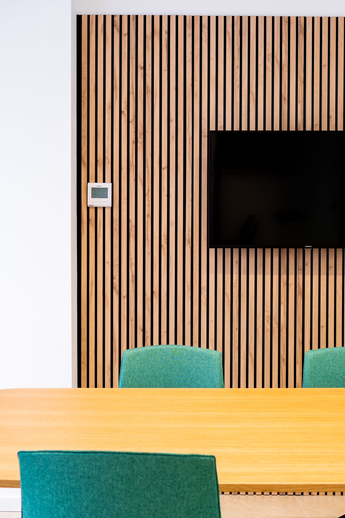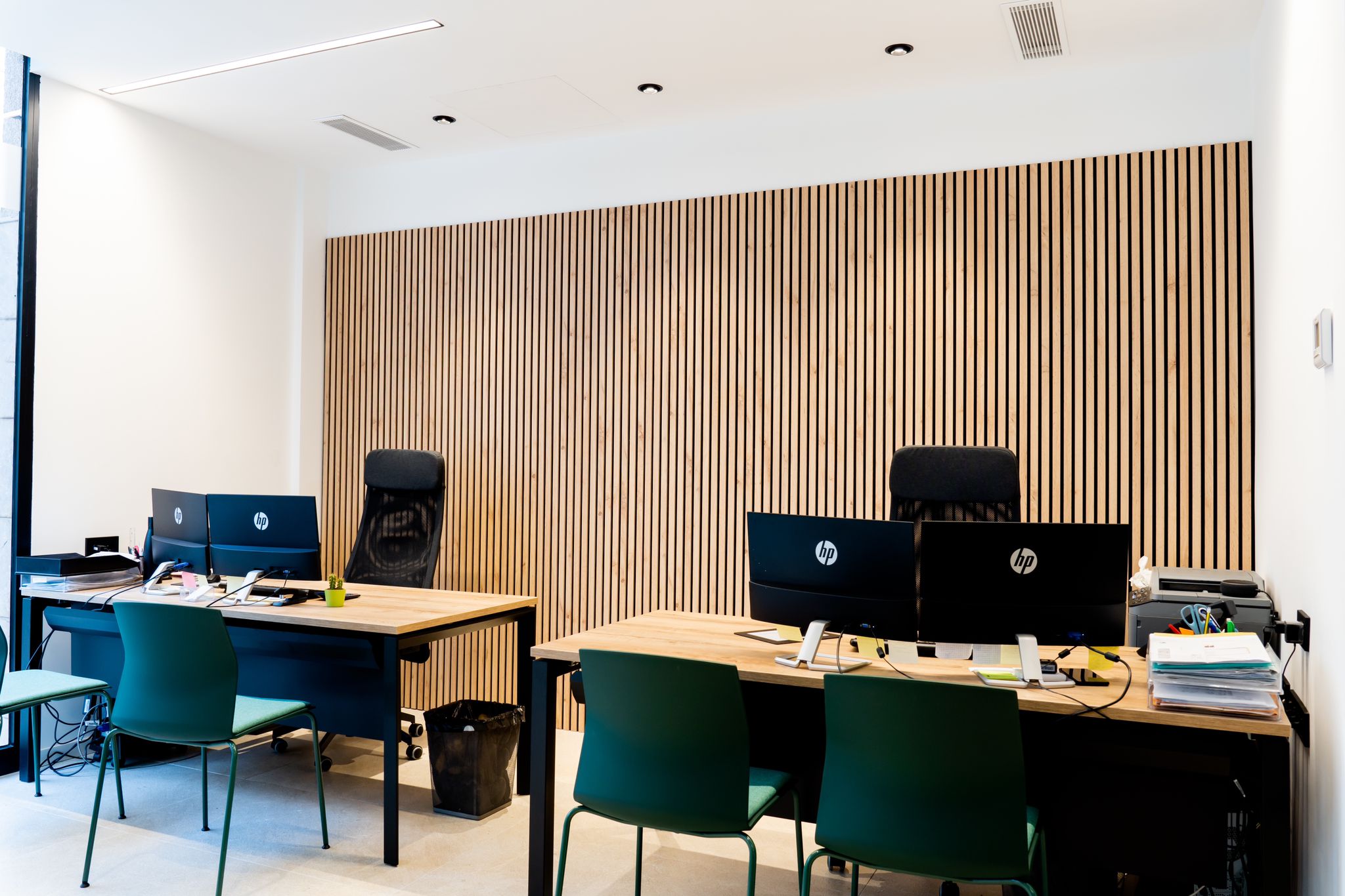 El sistema de climatización incluye fancoils y displays independientes. Se eligió un suelo porcelánico de 60x120 y mobiliario en tonos roble con detalles en negro mate, además de paneles acústicos decorativos.